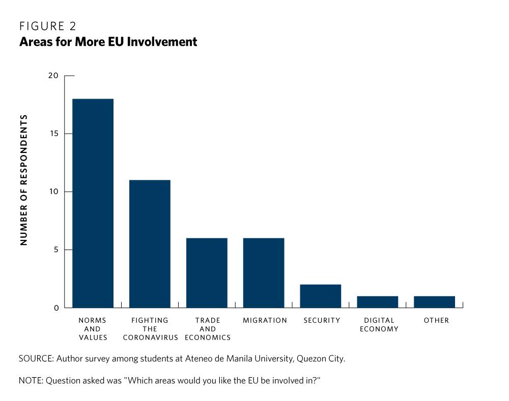 One challenge in the design of this report was to avoid generating Eurocentric questions that test European self-perceptions abroad, such as “Is the EU a trade power? Or a normative power? Or a global regulator? A model of regional integration?” To avoid confirmation bias, researchers investigated the issues through open-ended questions in seven fields: trade, security, values, climate, the digital economy, migration, and the coronavirus pandemic. They explored questions that compared Europe or the EU—which are often seen interchangeably by less specialized audiences—with other actors, such as the United States, China, and Russia as well as individual European states, including former colonial powers. The researchers investigated general and historical perceptions of Europe by engaging with a variety of interlocutors—government officials, opposition figures, societal groups, business leaders, academics, students, and local community leaders—who were also asked about what they would like to see from the EU.